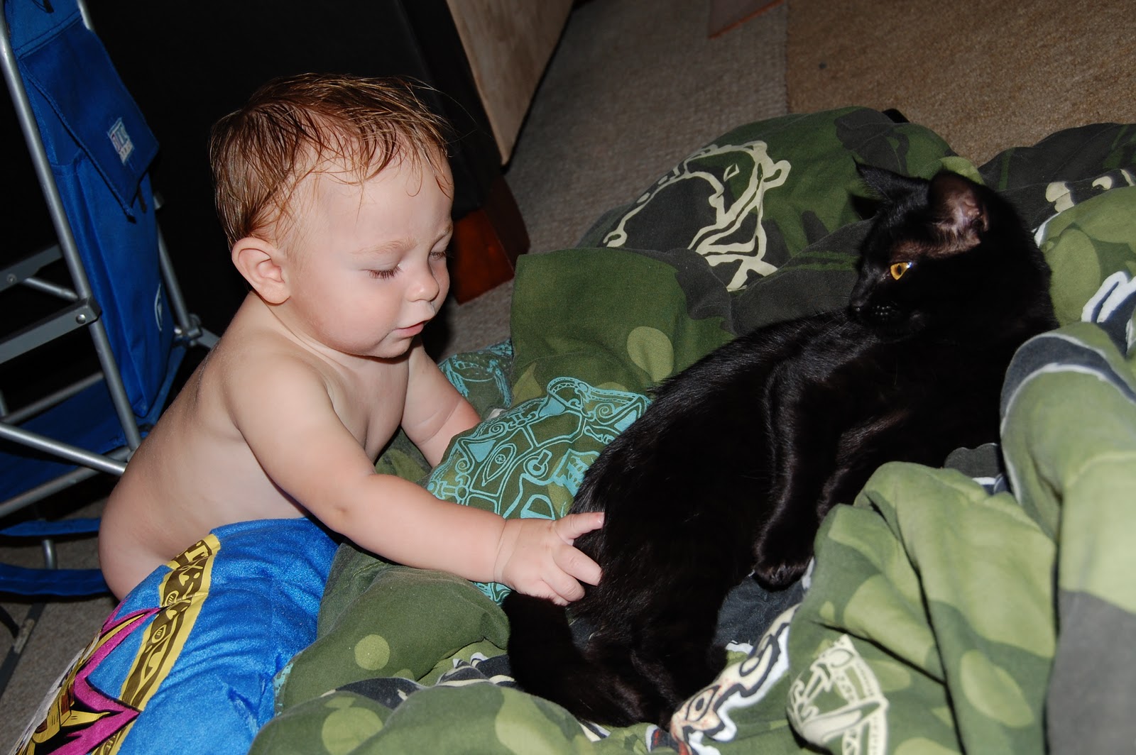 She has taken quite a liking to me which I am liking as well. She's a super snuggler. She kisses freedom goodnight and loves chasing him through the house. I can't even tell you how many hours have already been filled with rolling belly laughter thanks to her. She is so well tempered for a kitten. When Cypress attempts to pet her (which is code for slap and pull her hair and ears) she doesn't even flinch or raise a paw. She sleeps with me at night and you should. see her nap, she sleeps all stretched out on her back, it's hilarious! She also loves her belly rubbed. She has just been the prefect addition to our family and we couldn't be happier. I can't imagine why anyone would ever get rid of such loving adorable cat but our guess was someone had a litter and couldn't get rid of all the kittens. Whatever the reason we couldn't be happier they did.